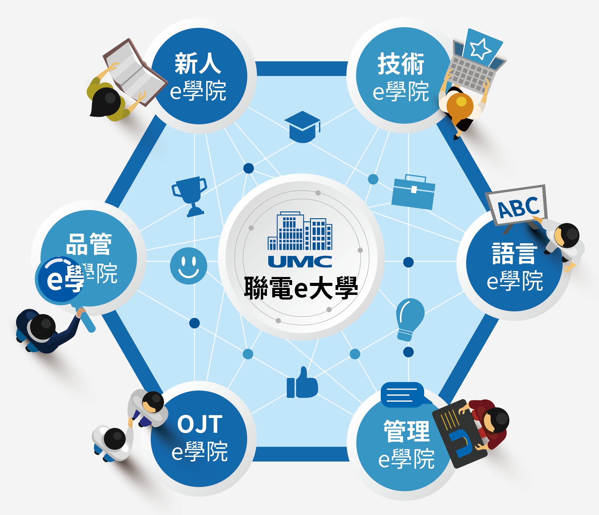 以 One-shop Service 之精神,在公司內部建立屬於全公司同仁的訓練網頁,整合所有訓練系統及資訊,並以e化運作之方式,讓公司內部同仁能夠通暢無阻的取得所需資訊,規劃並進行相關學習計畫。 以六大e學院,成立「聯電e大學」(e-University),搭配電子報與文章中心之資訊傳遞,讓公司同仁於知識社群中互相學習、互相分享。